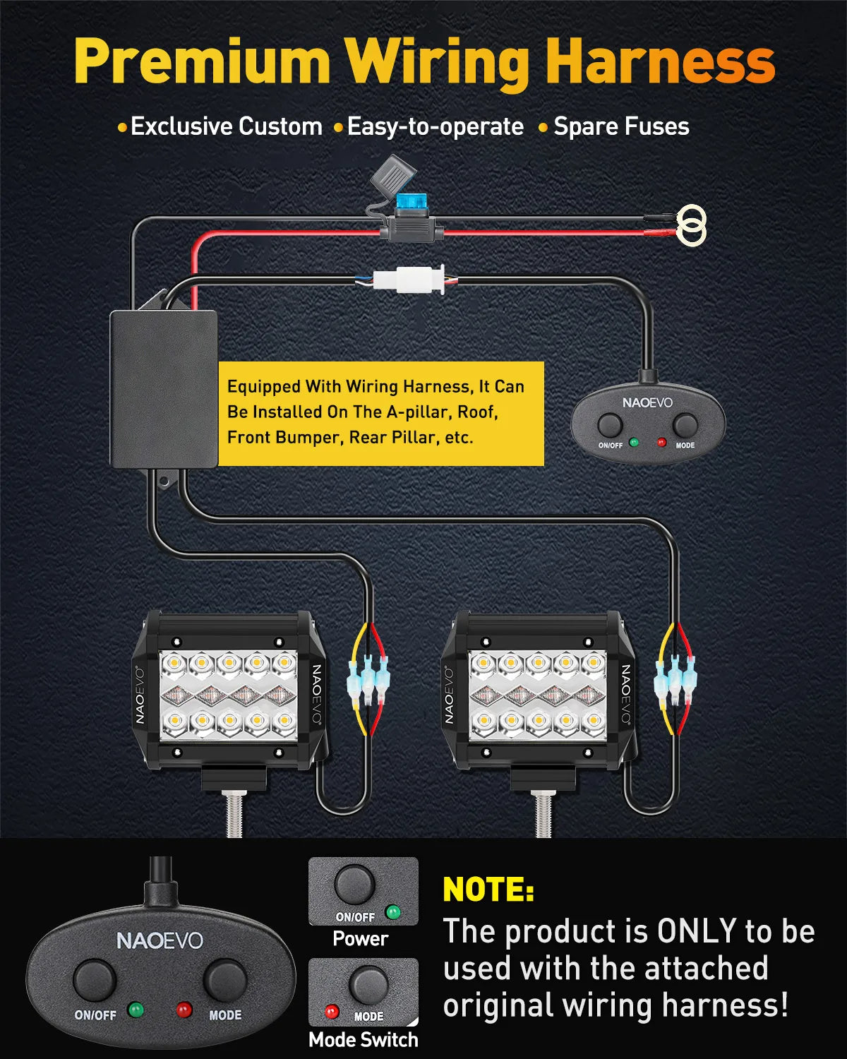The light set comes with complete set including: 1pair 7 inch Led Lights with wiring harness, 1*Mounting Bracket Kits. The included controller has a power on/off button and a switch mode button, which is very easy to operate in use.